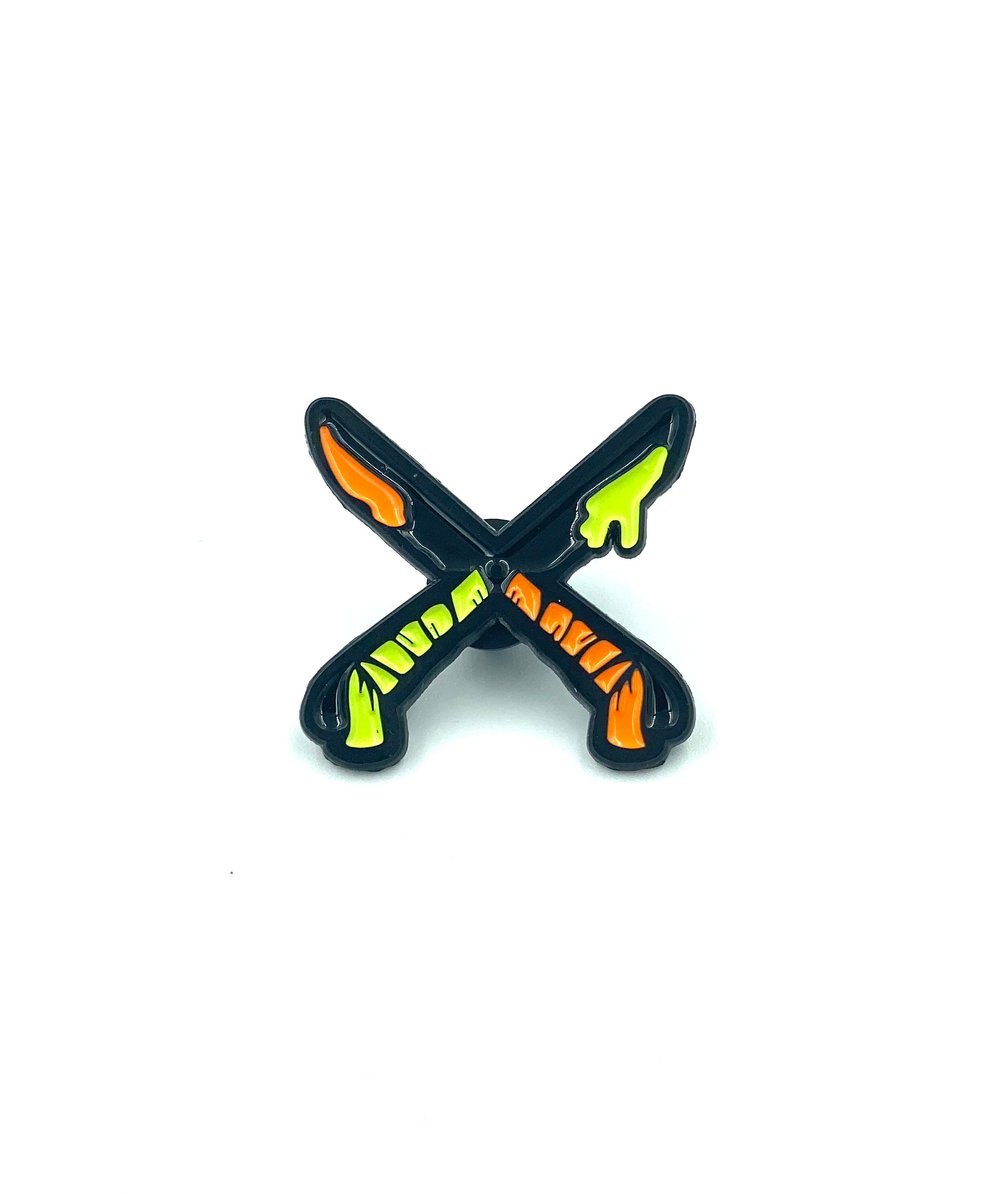 This soft enamel pin is 1.25 inches tall with a black metal finish.
