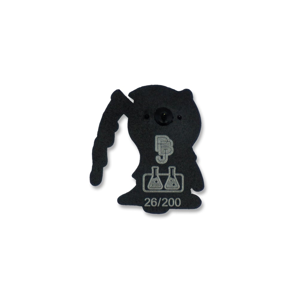 This soft enamel pin is 1.25 inches tall with an black metal finish. Each pin is individually numbered to 200 and comes on a special Spot UV card back.