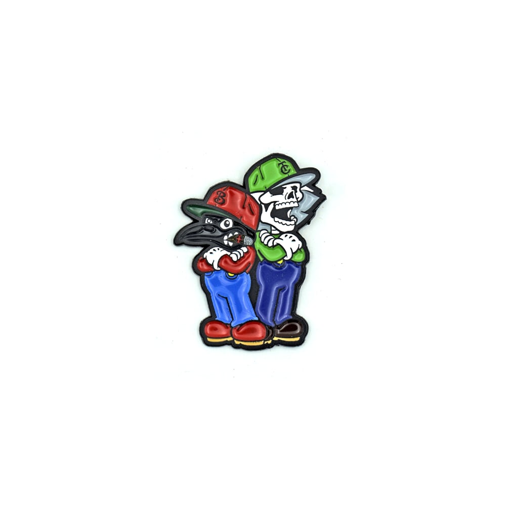 Jefferson George and Charles "Cappy" Torva, the mascots for Brothers Kinetic Systems and The Capologists have joined forces to form the Super Blood Bros. Rep the team with this enamel pin!